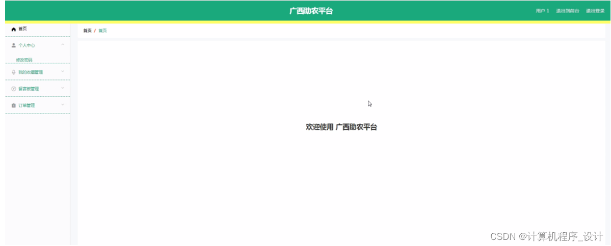用户登录进入广西助农平台后台可以查看首页、个人中心、我的收藏管理、留言板管理、订单管理等内容,如图5-11所示。