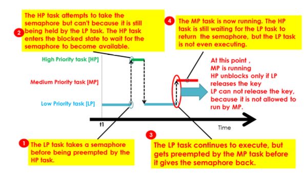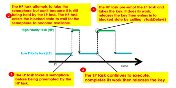 在上图中,有个低优先级的任务(LP)和高优先级的任务(HP),两个任务都可以对一个资源进行操作。为了对资源进行保护采用了信号量的机制。LP首先获得信号量可以对资源进行操作,在时刻1,HP因为优先级高在内核调度中抢占了LP,在时刻2,HP想获得信号量但失败因此进入了阻塞状态。之后LP可以继续对资源操作,在时刻3执行完毕后归还了信号量。在时刻4,HP因为优先级高在内核调度中抢占了LP并获取了信号量可以对资源可以操作。