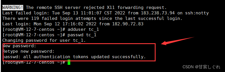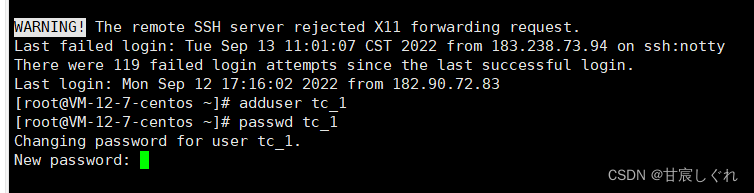 创建用户指令:adduser 用户名 (如 adduser tc)