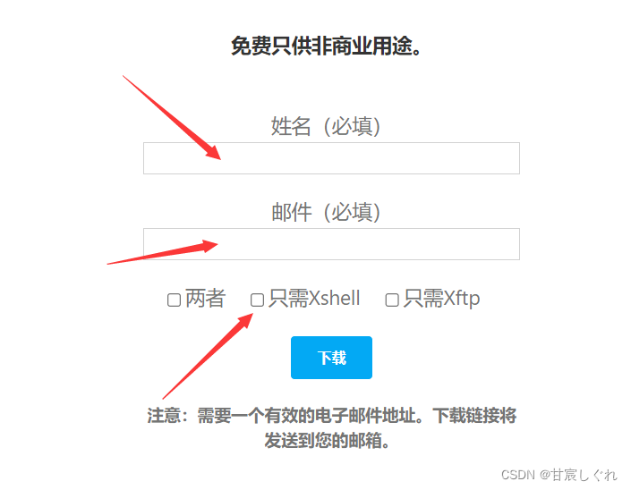 填自己的姓名以及能收到邮件的邮箱,选择只需要XShell就可以了,接下来就会有一封邮件发入你的邮箱中,点击邮箱的链接就可以下载正规的XShell了。
