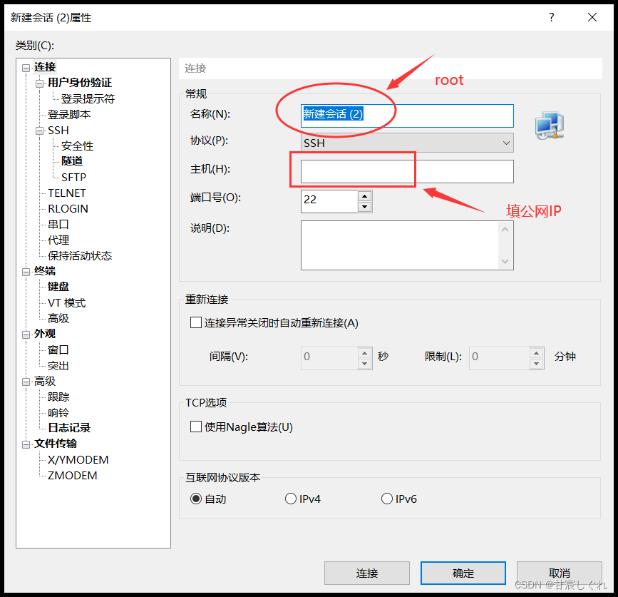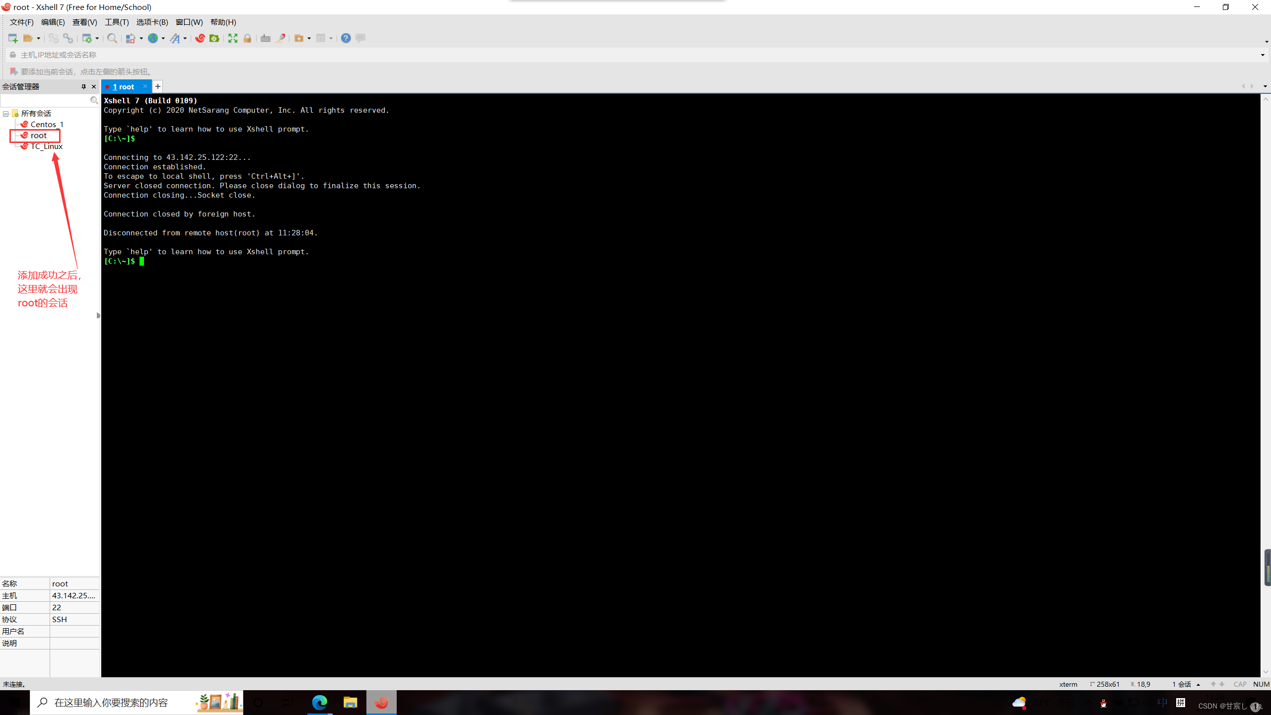 点击这里的添加键,添加会话(这里这样操作只是为了以后经常登陆更加方便,不需要的可以直接跳过看下一个标题):