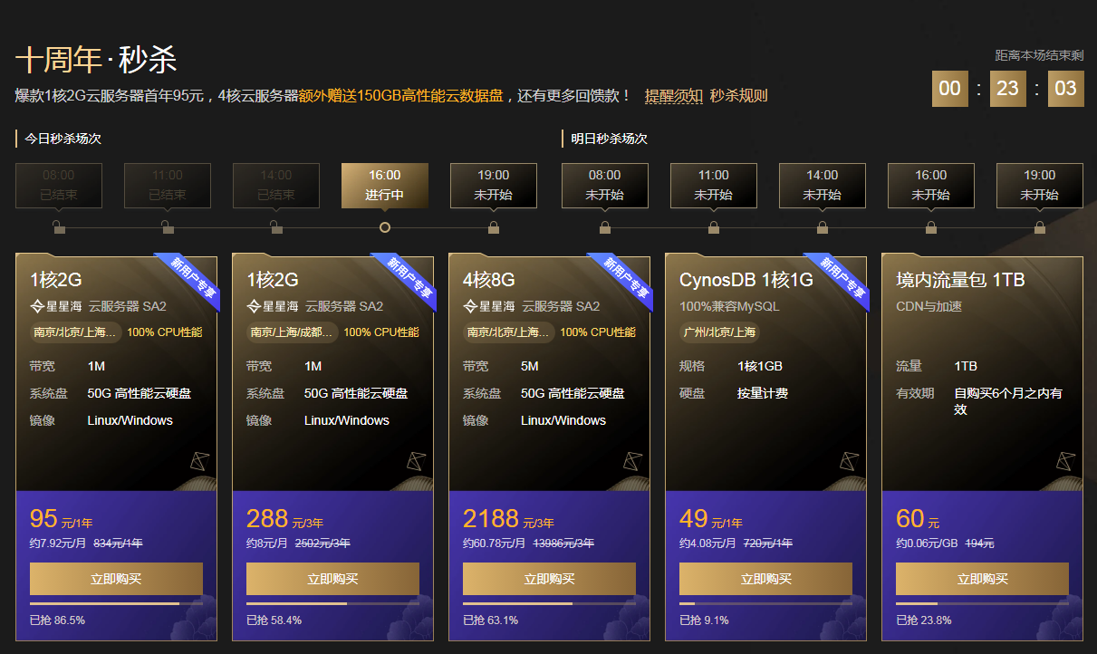 这里我们可以看到每天有五场秒杀活动,可以看到第二天活动。如果有需要看准时间选择,当然有标注新用户的,必须新用户资格。