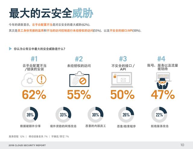 云安全面临的最大威胁——在今年的调查中,云平台的配置不当跃居第一位,成为对云安全的最大威胁(62%)。其次是通过滥用员工凭据和不正确的访问控制(55%)和不安全的接口/API(50%)进行未经授权的访问。