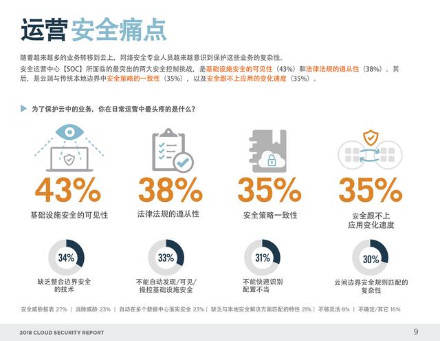 云安全痛点——随着更多的业务转移到云端,越来越多的网络安全专业人员意识到保护这些业务的复杂性。安全运营中心【SOC】所面临的三大安全控制挑战是:基础设施安全性(43%)、法律法规遵从性(38%)以及云和本地安全策略的一致性(35%)。