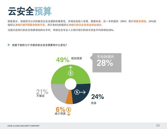 云安全预算增加——展望未来,近一半的组织(49%)预计云安全预算将上升,预算中值增长28%。