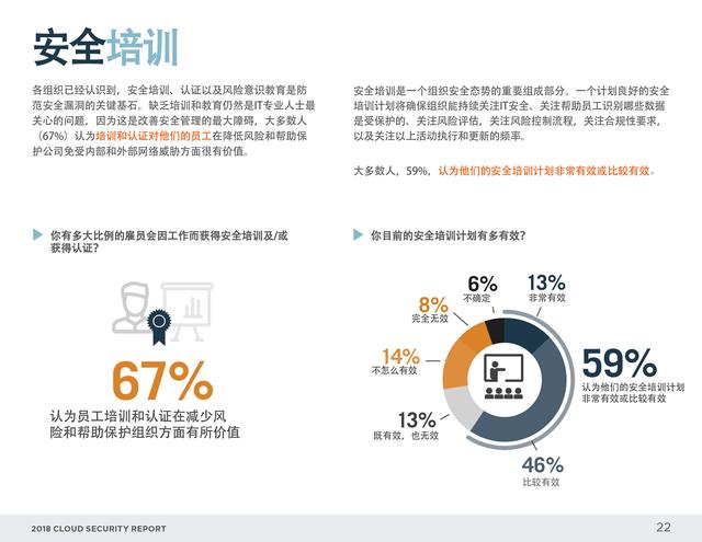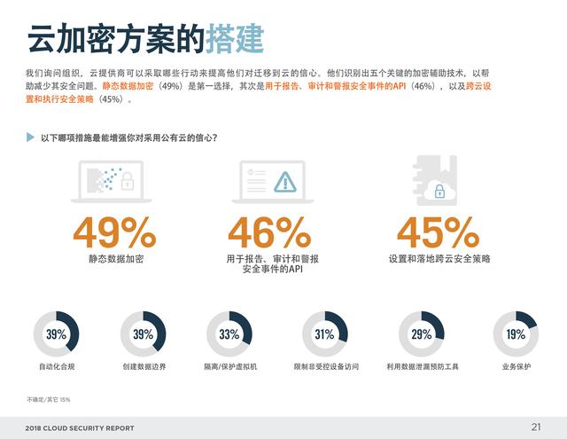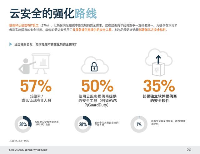 增强云安全性的途径——为满足不断变化的安全需求,连续两年,培训和认证现有IT人员(57%)是最流行的途径。50%的受访者选择了使用云提供商的安全工具,35%的受访者部署第三方安全软件,以确保实现适当的云安全控制。