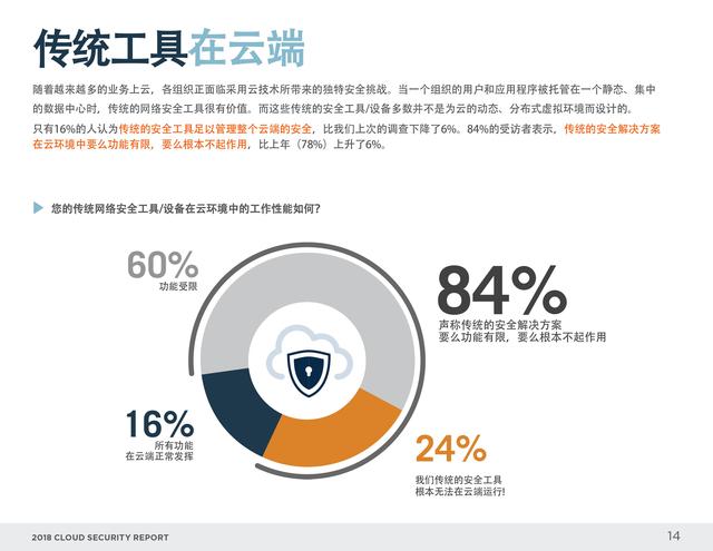 传统安全工具对云环境作用有限——只有16%的受访组织单位报告说,传统安全工具的能力足以管理整个云端的安全性,比我们之前的调查下降了6个百分点。84%的受访者表示,传统的安全解决方案要么根本不适用于云环境,要么功能有限。