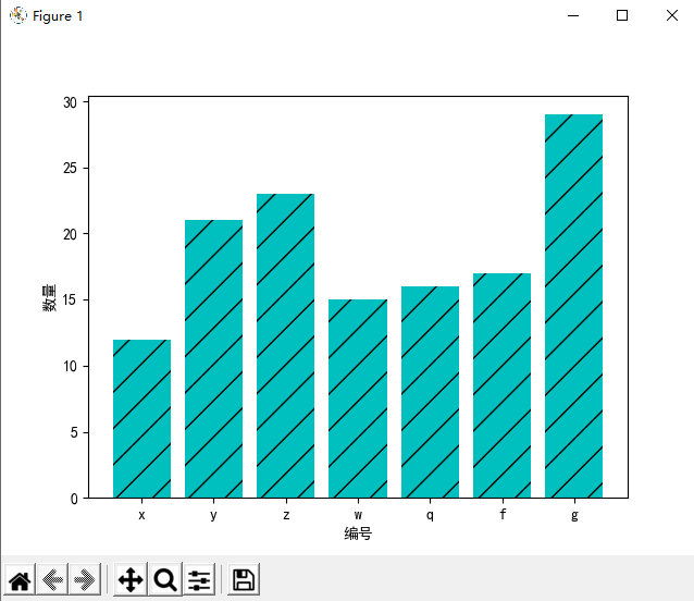plt.bar(x, y, align="center", color="c", tick_label=["x", "y", "z", "w", "q", "f", "g"], hatch="/")