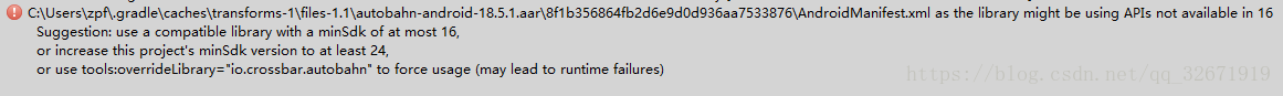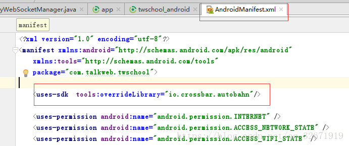 解决办法:(2)AndroidManifest.xml 中添加 <uses-sdk tools:overrideLibrary="io.crossbar.autobahn"/>