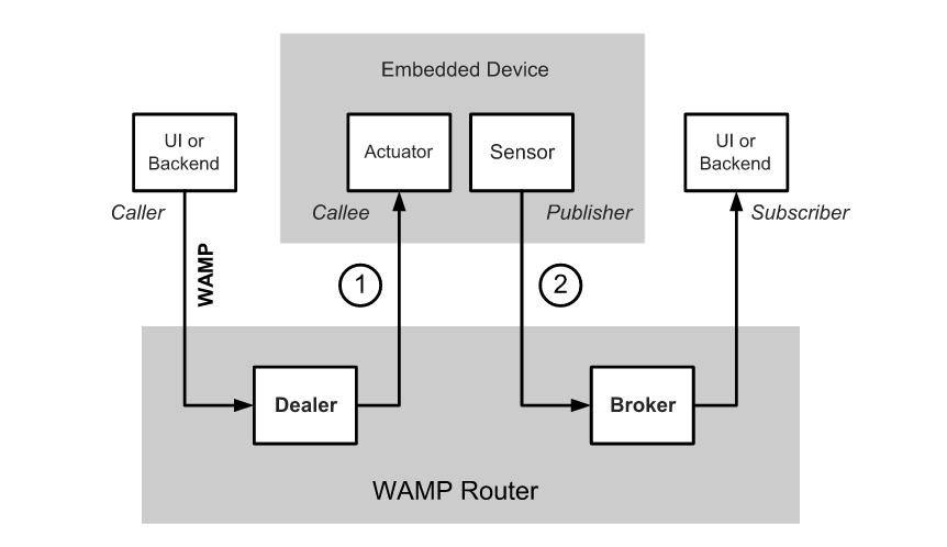 使用WAMP,可以有一个基于浏览器的UI及嵌入式设备和后端实时交谈,从基于浏览器的UI打开设备上的灯自然通过在设备(1)上调用远程过程来完成。 并且由设备连续生成的传感器值通过发布和订阅(2)自然地传输到后端组件(并且可能是其他组件)。