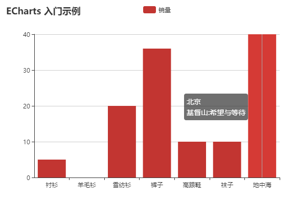 <!DOCTYPE html> <html> <head> <meta charset="utf-8"> <title>ECharts</title> <!-- 引入 echarts.js --> <script src="echarts.min.js"></script> </head> <body> <!-- 为ECharts准备一个具备大小(宽高)的Dom --> <div id="main" style="width: 600px;height:400px;"></div> <script type="text/javascript"> // 基于准备好的dom,初始化echarts实例 var myChart = echarts.init(document.getElementById('main')); // 指定图表的配置项和数据 var option = { title: { text: 'ECharts 入门示例' }, tooltip: { trigger: 'axis', formatter: function (datas) { var res = datas[0].name + '<br/>' // for (var i = 0, length = datas.length; i < length; i++) { // res += datas[i].showText + ':' // + datas[i].text + '<br/>' // } res=res+'基督山:'+datas[0].data.text return res } }, legend: { data: ['销量'] }, xAxis: { data: ["衬衫", "羊毛衫", "雪纺衫", "裤子", "高跟鞋", "袜子", "地中海"] }, yAxis: {}, series: [{ name: '销量', type: 'bar', data: [5, '_', 20, 36, 10, 10, { value: 40, name: '北京', text: '希望与等待', showText: '100' }] }] }; // 使用刚指定的配置项和数据显示图表。 myChart.setOption(option); </script> </body> </html> <!-- https://blog.csdn.net/shenhonglei1234/article/details/77479432/ --> <!-- http://echarts.baidu.com/option.html#visualMap --> <!-- http://echarts.baidu.com/echarts2/doc/doc.html#SeriesData --> <!-- https://www.imooc.com/video/12203 -->