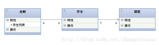 上图中,老师与学生是双向关联,老师有多名学生,学生也可能有多名老师。但学生与某课程间的关系为单向关联,一名学生可能要上多门课程,课程是个抽象的东西他不拥有学生。