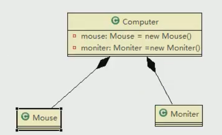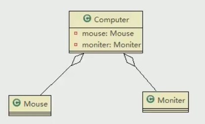 如:一 台电脑由键盘(keyboard)、显示器(monitor),鼠标等组成; 组成电脑的各个配件是可以从电脑上分离出来的,使用带空心菱形的实线来表示:
