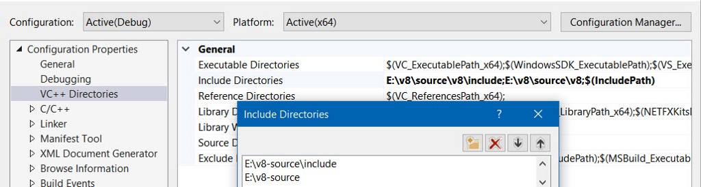接下来,我们需要添加文件夹以查找包含目录的 V8头文件: