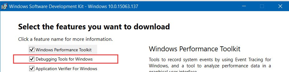 由于Chromium使用的Debugging Tools For Windows并未作为VS安装的一部分安装,因此您还需要单独安装Windows SDK。 在此处下载安装程序并进行安装。 确保已在安装程序中选择了软件包: