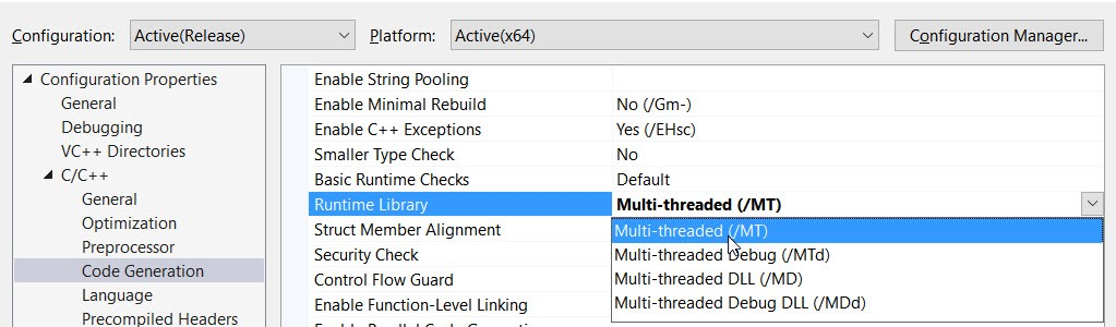 另外,我们需要使应用程序使用运行库的多线程静态版本: