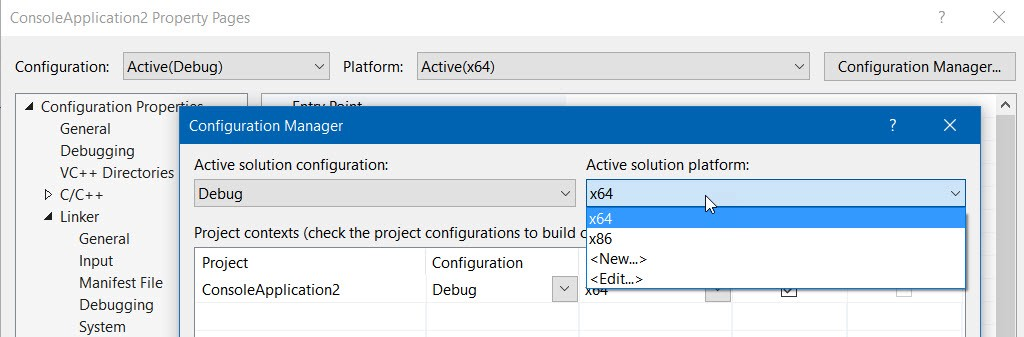 我们将V8嵌入到一个简单的控制台应用程序中。 按照此处 (不要选中Empty project)或此处所述的说明创建应用程序。 这将创建Win32应用程序,但是V8是为x64体系结构构建的,因此我们需要对项目进行一些修改。 为此,请转到项目属性并选择x64活动解决方案平台:
