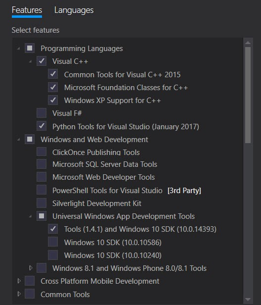 在Windows上构建V8需要Visual Studio附带的构建工具。 自2016年12月8日起,Chromium需要带有14393 Windows SDK的Visual Studio 2015 Update 3。 因此,继续并在此处下载带有Update 3的Visual Studio Community 2015的安装程序。 此页面需要会员资格,但是它是免费的,因此这里无后顾之忧。 现在运行安装程序,并确保选择以下内容: