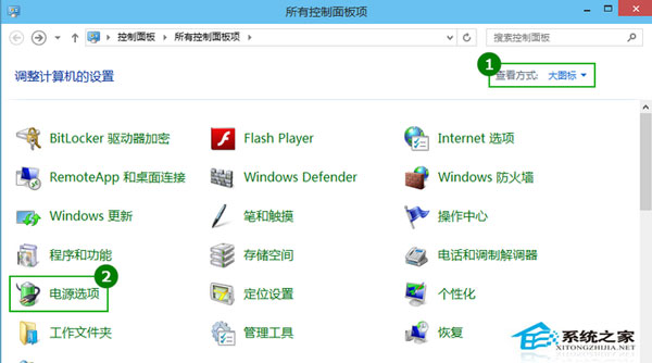 1.在Win10的控制面板中点击“电源选项”,如果找不到要将查看方式切换为“大图标”。