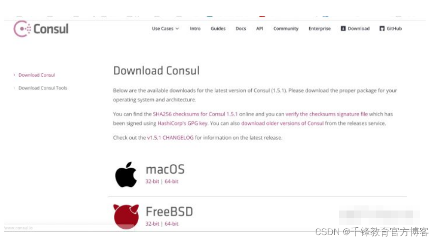 - 安装:在官方文档中,点击Download按钮,进入下载软件界面https://www.consul.io/downloads.html,选择自己本机系统的类型,如下图所示: