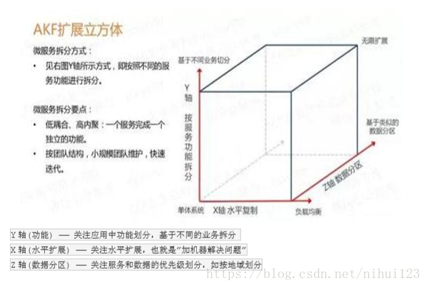 这个理念在“云计算”概念疯狂流行的当今社会,得到了广泛的认可,对于一个规模迅速增长的系统而言,我们讨论最多问题就是容量和性能的问题。但是随着时间的推进,系统规模的增长,除了面对性能和容量的问题,还需要面对功能与模块数量的增长带来的系统复杂性增长的问题,以及业务变化带来的提供差异化服务的问题。而许多的系统再设计的时候并没有充分的考虑到这个问题,导致系统的重构成为了常态,从而影响到了业务的交付能力,还浪费人力财力!对此《可扩展性艺术》一书中提出了一个更加系统的可扩展模型——AKF可扩展立方。这个立方体沿着三个坐标轴的方向分别是XYZ。