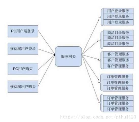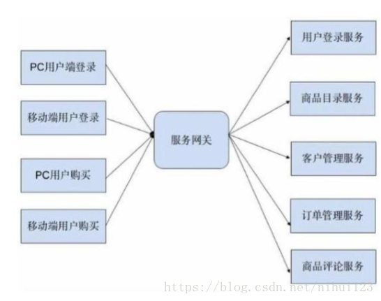 但是通过观察上图,容易发现,当服务数量增多时候,服务调用关系也变得开始复杂。为系统添加一个新功能,要调用的服务数量也变得不可控,由此引发了服务管理上的混乱。所以,一般情况下,需要采用服务注册的机制形成服务网关来进行服务治理,系统的架构设计将变成下图所示: