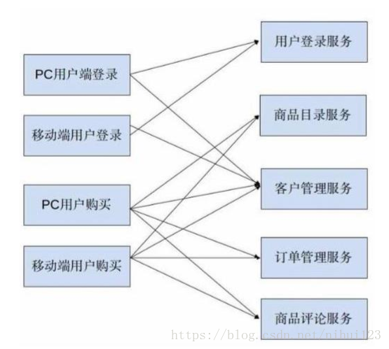 Y轴扩展会加将庞大的整体应用拆分为多个服务。每个服务实现一组相关功能,例如订单管理、客户管理等。在工程上常见的方案是服务化架构(SOA),比如对一个电子商务平台,我们可以拆分成为不同的服务,组成下面这样一个架构:
