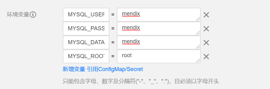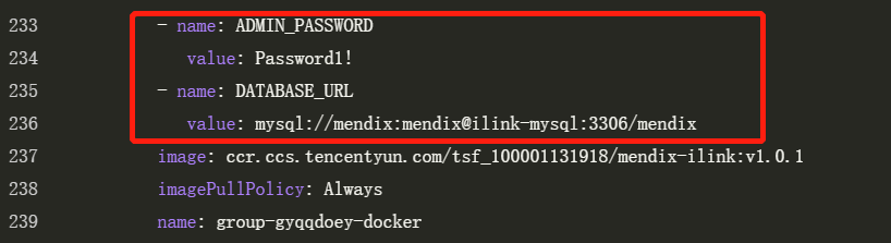 - name: ADMIN_PASSWORDvalue: Password1!- name: DATABASE_URLvalue: mysql://mendix:mendix@ilink-mysql:3306/mendix##另外一个添加内容:- name: ADMIN_PASSWORDvalue: Password1!- name: DATABASE_URLvalue: mysql://mendix:mendix@ilink-mysql:3306/mxIlink##两者数据库实例不同即可