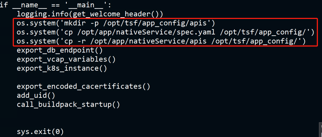 os.system('mkdir -p /opt/tsf/app_config/apis')os.system('cp /opt/app/nativeService/spec.yaml /opt/tsf/app_config/')os.system('cp -r /opt/app/nativeService/apis /opt/tsf/app_config/')