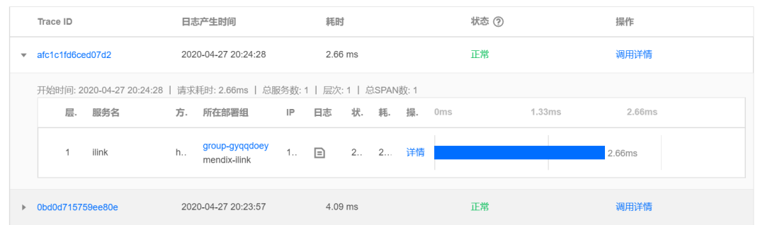• 调用链查询及详情,以接口维度快速定位服务异常,发现系统瓶颈。