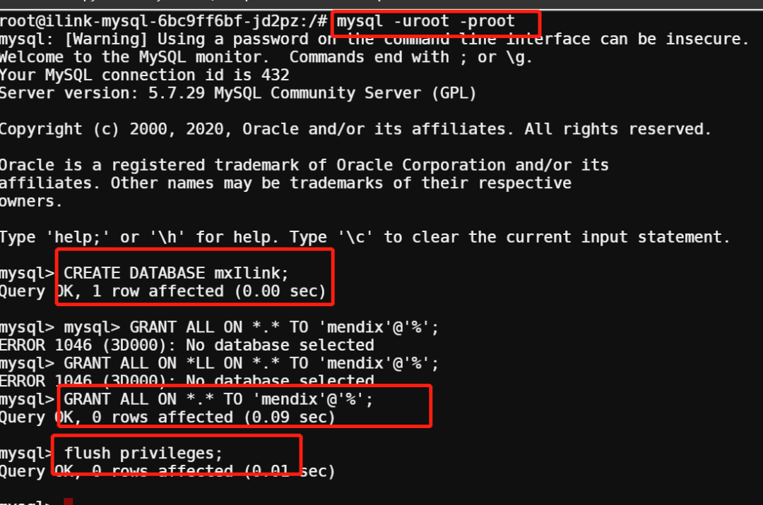 create database mxIlink;GRANT ALL ON *.* TO 'mendix'@'%';flush privileges ;