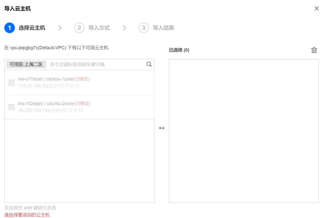 导入云主机,以下是已经绑定过的,选择之间创建好的2台云服务器即可。