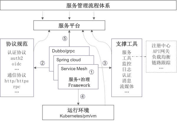 治理支撑服务包括服务注册/发现,流量控制,容错熔断,服务升级/回滚,链路跟踪,路由分发,超时重试,智能恢复等支撑工具集成。