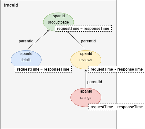 从图中可以看到,这是一个用户访问 productpage 页面的请求。在请求过程中,productpage 服务顺序调用了 details 和 reviews 服务的接口。而 reviews 服务在响应过程中又调用了 ratings 的接口。整个链路跟踪的记录是一棵树: