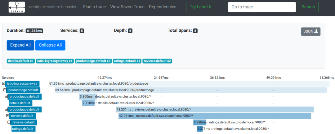 我们用一个 Istio 文档里的链路跟踪例子来看看效果: