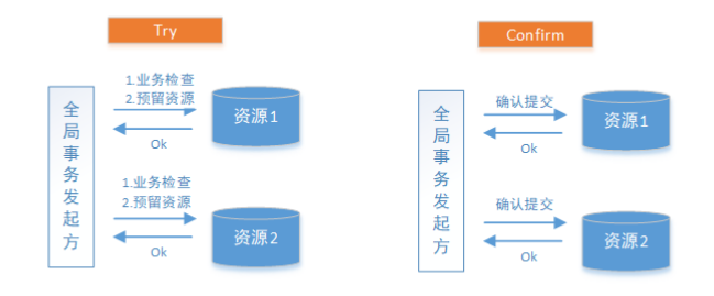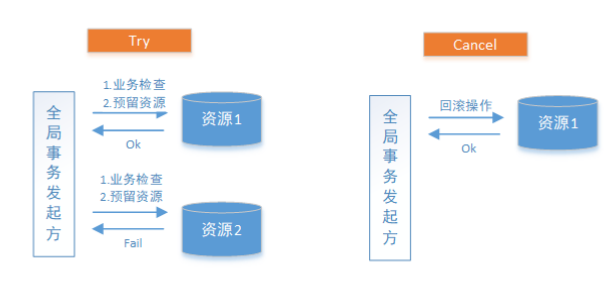 TCC是分布式事务的又一种解决方案。TCC要求每个分支事务实现三个操作:预处理Try、确认Confirm、撤销Cancel。Try操作做业务检查及资源预留,Confirm做业务确认操作,Cancel实现一个与Try相反的操作即回滚操作。TM首先发起所有的分支事务的try操作,任何一个分支事务的try操作执行失败,TM将会发起所有分支事务的Cancel操作,若try操作全部成功,TM将会发起所有分支事务的Confirm操作,其中Confirm/Cancel操作若执行失败,TM会进行重试。