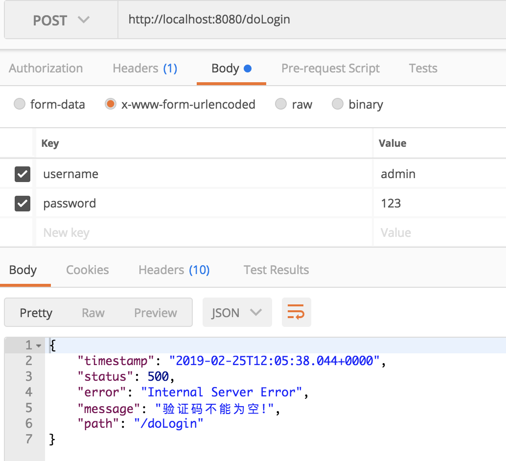 接下来在登录中,就需要传入验证码了,如果不传或者传错,都会抛出异常,例如不传的话,抛出如下异常: