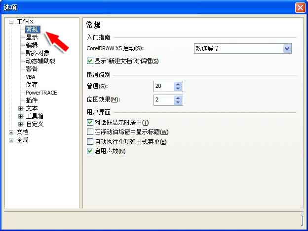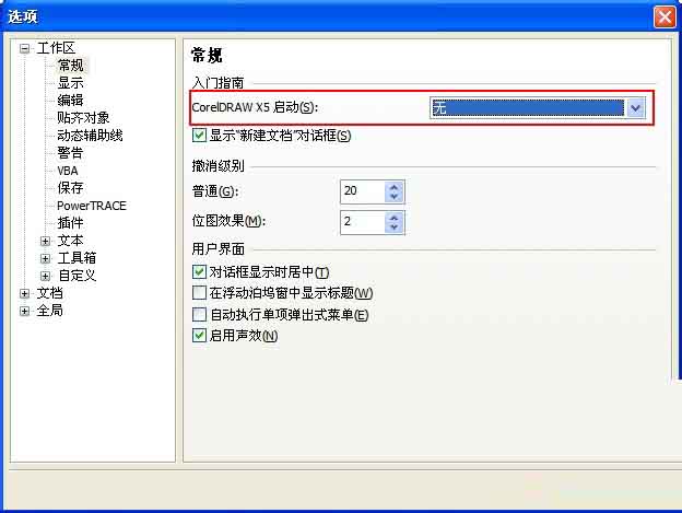 5、在常规项的右边,将【CorelDRAW X5启动】模式,从“欢迎屏幕”改为“无”就可以了