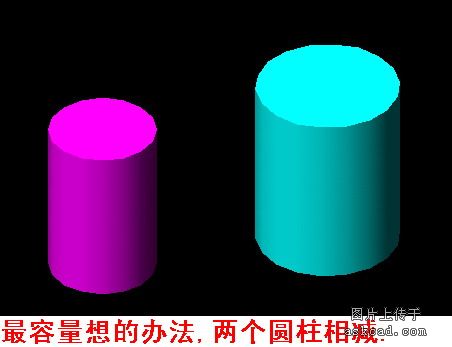 4、先伸好了大圆柱后,利用ucs移动坐标,把大圆柱的顶面作为x-y平面,然后在圆柱顶面捕捉圆心点作为小圆的圆心,画好小圆后拉伸成小圆柱(拉伸这时要取负数!回头看看上面的讲解,注意看当前坐标轴就会明白为什么么了,就这么简单。)