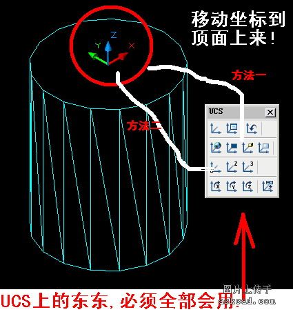 小议:这是最容易想到的办法,任何初学的朋友都会想到这一点,但是不要认为简单就不留意哦,相当多的朋友用这种方法画出来的杯子是开口向下的,而底面向上的。这是初学最容易不注意的地方之一,为什么会这样呢,看过上集的朋友想想就明白了,因为auto cad有个极其重要的东西,很多人不注意,结果画了几个月还不断出错就来源于此,auto cad画图是默认在"x-y"平面进行的(切记!切记!),在三维中同样是这样的,所以画图时眼睛一定要时常留意"坐标轴图示"的变化(切记!切记!!!),auto cad画图在空间是默认以"z"轴正方向为上的(切记!)。