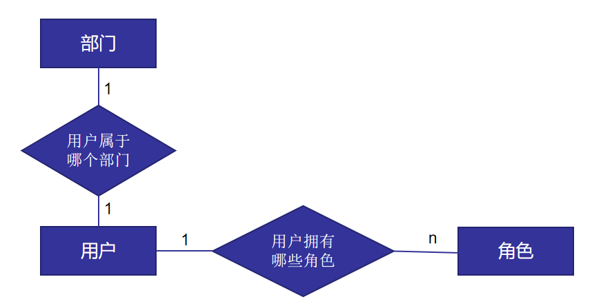 在面向对象分析和设计中,通过用例图可以明确一个应该系统中有哪些用户、用户分哪些角色、用户属于哪个组织架构、各种用户或角色有哪些行为,通过E-R图来分析一个应用系统中的用户有哪些属性、用户与组织架构之间的关系、用户与角色之间的关系。1个用户属于1个部门,1个用户拥有1个或多个角色。用户属于哪个部门,则表示该用户只能查看与该部门关联的数据,这可以通过数据权限实现,也可以通过用户与部门之间的关联以及部门与其数据之间的关联推导出用户可查看哪些数据;用户拥有哪些角色,则表示该用户拥有这些角色赋予的权限。