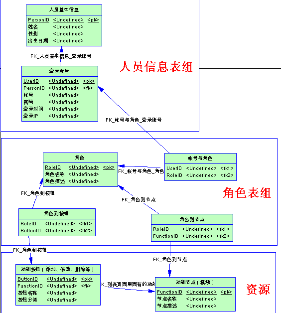 这样我们就需要增加一个表“功能按钮”(也可以叫做具体操作表)来记录一个节点有哪些功能(操作),还需要增加一个表“角色到按钮”来记录一个角色可以使用哪些功能(操作)。表结构图如下: