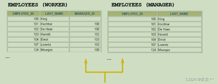 WORKER 表中的 MANAGER_ID 和 MANAGER 表中的 EMPLOYEE_ID相等