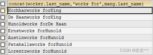 SELECT CONCAT(worker.last_name,'works for',mang.last_name)