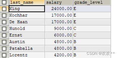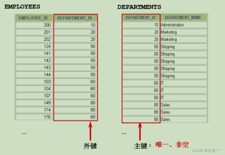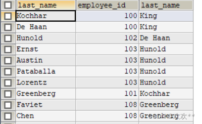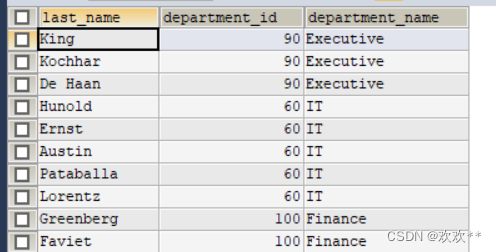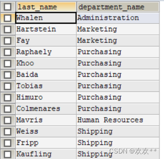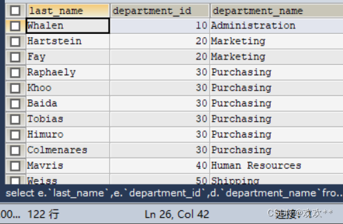#查询员工姓名及其部门名称 SELECT last_name,department_name FROM employees,departments WHERE employees.`department_id` = departments.`department_id`;其查询部分结果为