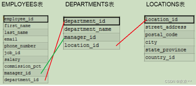 我们可以看到EMPLOYEES表、DEPARTMENTS表和LOCATIONS表,这三张表之间引发的多表连接。