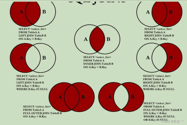 - 需要注意的是,MySQL不支持FULL JOIN,但是可以用LEFT JOIN UNION EIGHT JOIN 代替。