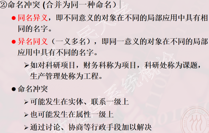 - 集成局部视图,合成总E-R图,消除分E-R图中三类冲突;