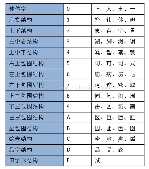 第一位被称为结构位,根据汉字的不同结构,用一个字符来表示该汉字的结构。