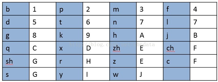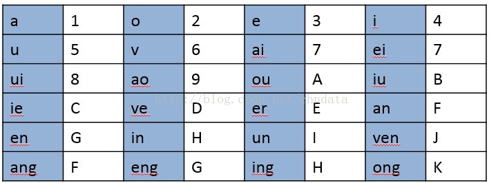 第一位,是韵母位,通过简单的替代规则,将汉字的韵母部分映射到一个字符位。汉字的拼音中一共有24种韵母,其中部分为了后期计算目的,采用相同的字符来替代,以下是一张完整的匹配表: